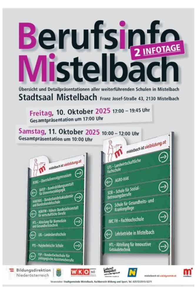Am 10. und 11. Oktober wurde im Stadtsaal die BIMI – die Berufs- und Bildungsinformationsmesse Mistelbach – für alle Schüler:innen der 3. und 4. Klassen Mittelschule bzw. Gymnasium veranstaltet. Nach einer Gesamtpräsentation des Schulangebotes in Mistelbach hatten die interessierten Jugendlichen mit ihren Eltern die Gelegenheit, die Messestände einzelner Schulen zu besuchen und in persönlichen Kontakt zu treten.