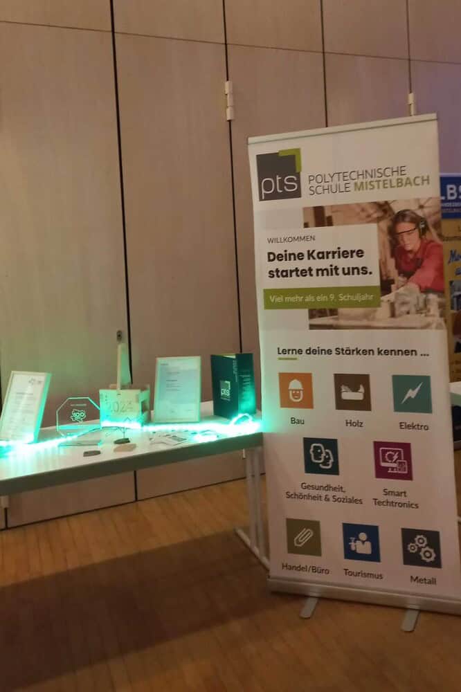 Selbstverständlich hat sich hier auch unsere Schule präsentiert: Herr Werner Weigl und Frau Kerstin Schmid gaben einen detaillierten Überblick über die Polytechnische Schule, sowie deren acht Fachbereiche, Inhalte und Schwerpunkte im Schuljahr wie Bewerbungsfitwoche, Finanzführerschein und Berufspraktische Wochen. Weiters wurden die vielfältigen beruflichen Möglichkeiten mit dem Einstieg in eine anschließende Lehre und die entsprechenden – für viele überraschend hohe – Verdienstaussichten ab 15 Jahren aufgezeigt. Aber auch auf die Gelegenheit, sich ein nicht allzu gutes Schulzeugnis zu verbessern und dann eine weiterführende Schulkarriere zu starten, wurde hingewiesen. All das ist mit dem Besuch unserer Schule möglich!
