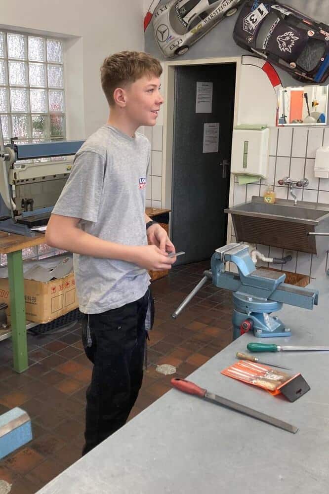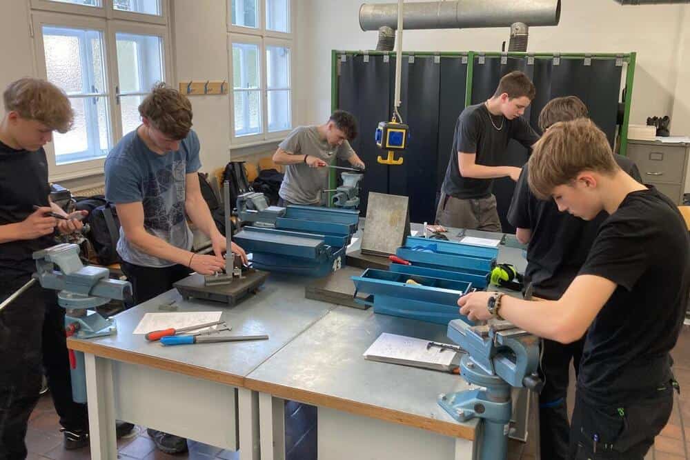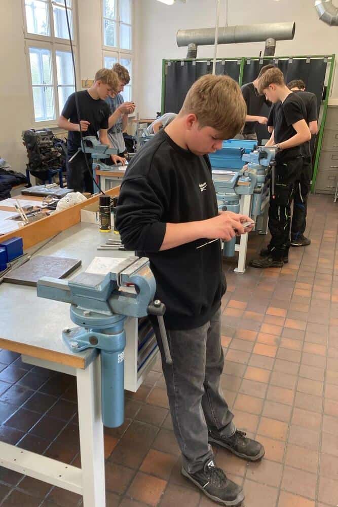 Im Fachbereich Metall wurde ein Lagerdeckel gefertigt. Dabei zählten genaues Anreißen, Sägen, Feilen und das präzise Schneiden von Gewinden – alles musste winkelig und maßgenau passen.